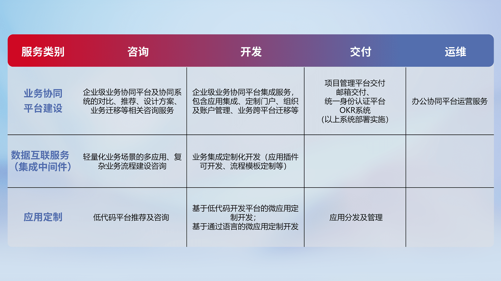 针对钉钉、、企微、、IDaas等平台级产品提供产品的规划、、、方案、、、、交付、、定制化开发等服务,,,,实现如统一协同办公、、、智能客户服务、、混合会议管理、、、、智能数据查询、、等业务场景,,实现数字化转型。。。