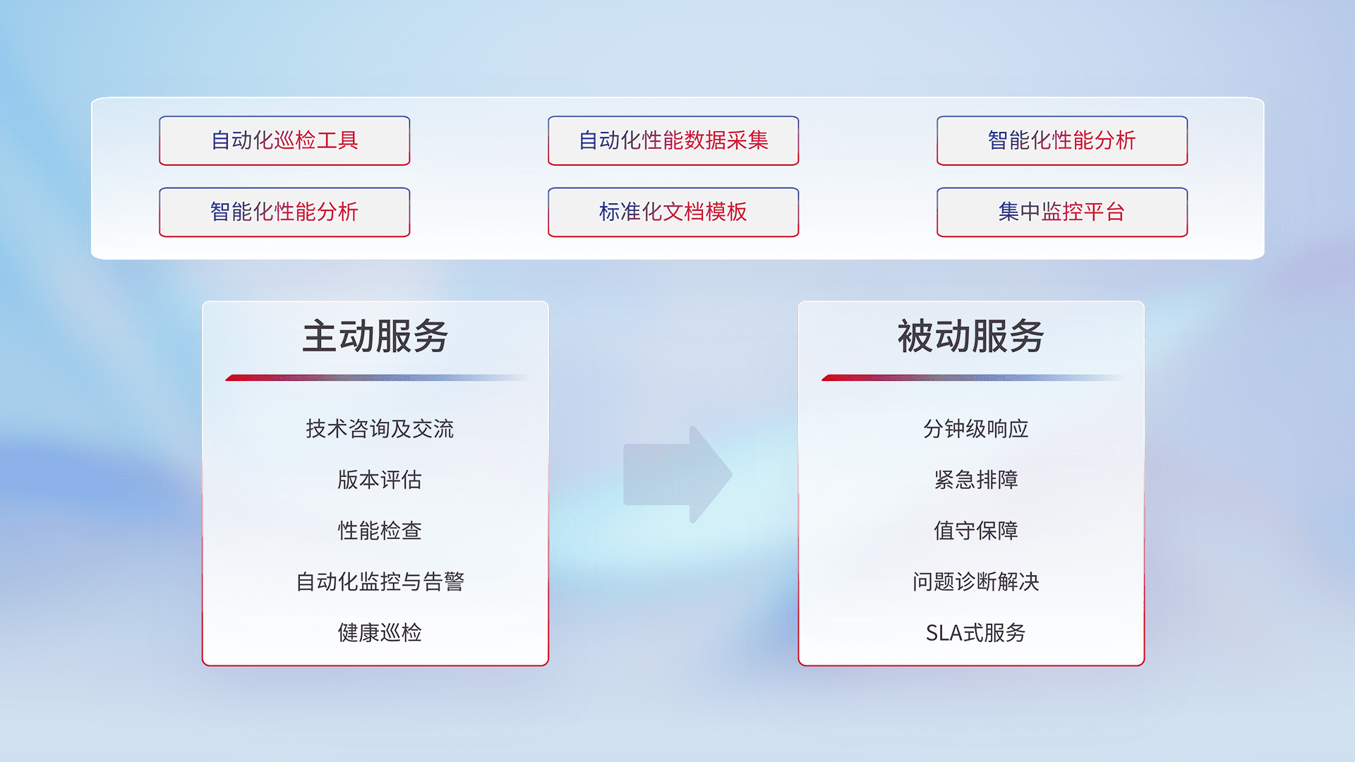 智能化工具和标准化文档,,,,保障服务质量,,,,提供主动服务(包含技术咨询、、、版本评估、、性能检查、、、、自动化监控与告警、、健康巡检)和被动服务包含(分钟级响应、、、紧急排障、、、、值守保障、、问题诊断解决、、SLA服务)。。